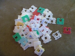 Okay, I have to admit that this is really hard for me, and I have no idea what to do with the little plastic squares. But you could use the corks to make a drip mat for a hot pot. And I remember that when I played in the school big band, the persussionist used to collect things like the little things you tear from a tin when you open it, or hub caps, to improve his percussions. Especially with Latin stardards this was great because it created this hand-made steel-drum atmosphere. So he’d have loved the Altoid tins for that. (The guy is a studied jazz percussionist by now.)
