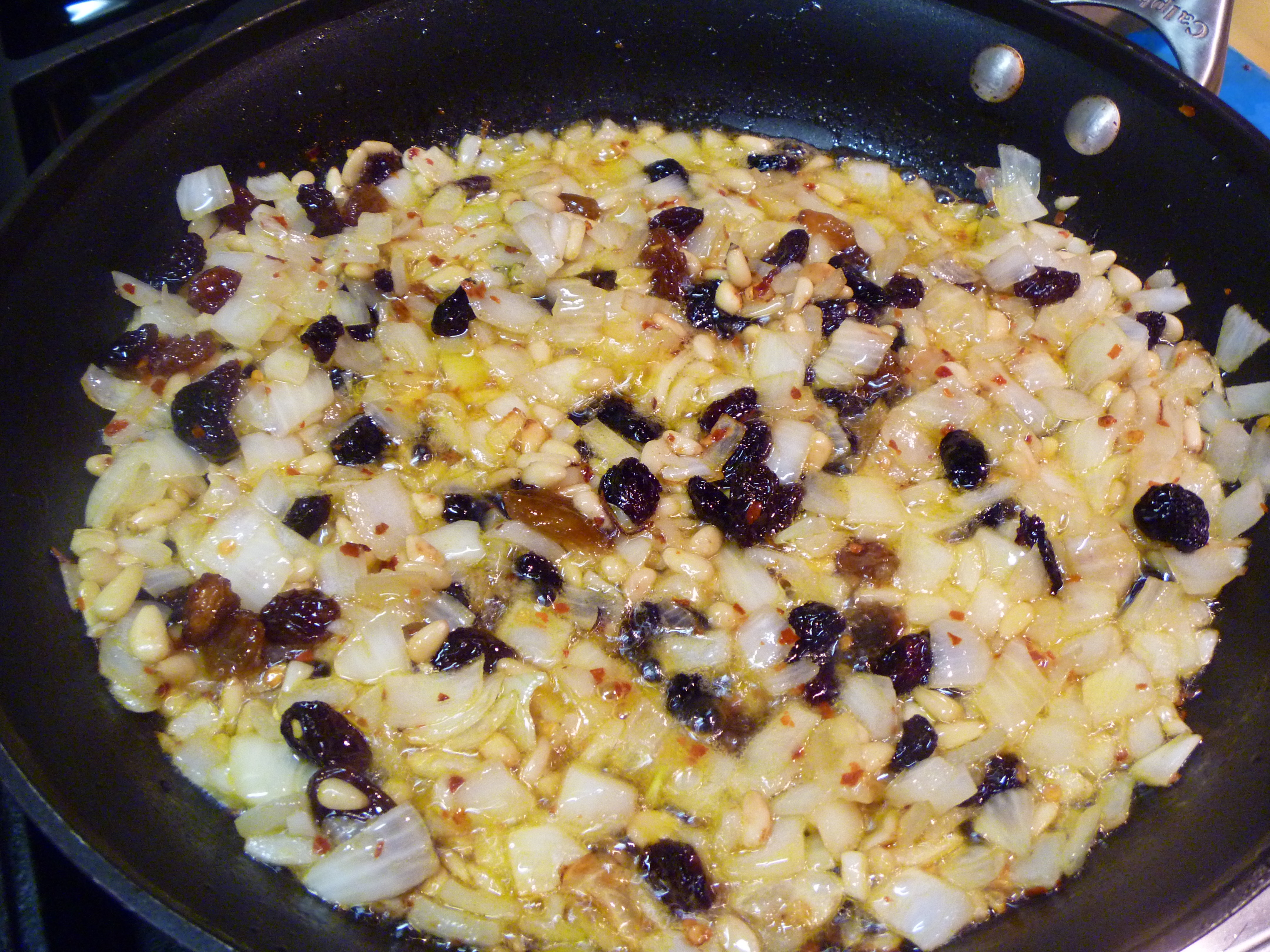 In a large  saute pan, over medium heat, heat the olive oil until hot but not smoking. Add the onions, pine nuts, raisins and chili flakes and saute for 4 to 5 minutes until softened.