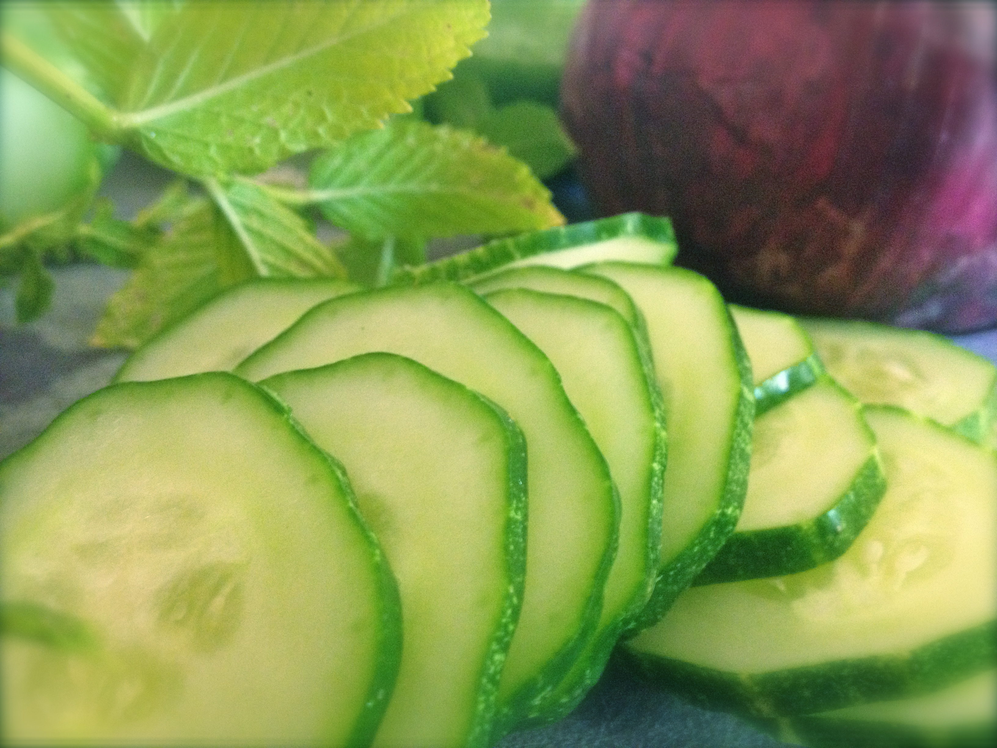 Gently toss together the sliced cucumbers, red onion, mint leaves with a little bit of white vinegar and olive oil, salt and pepper to taste. Right before serving, sprinkle on crumbled bits of feta cheese. Serve immediately. Vegan? Replace the feta with sliced radishes and black olives.