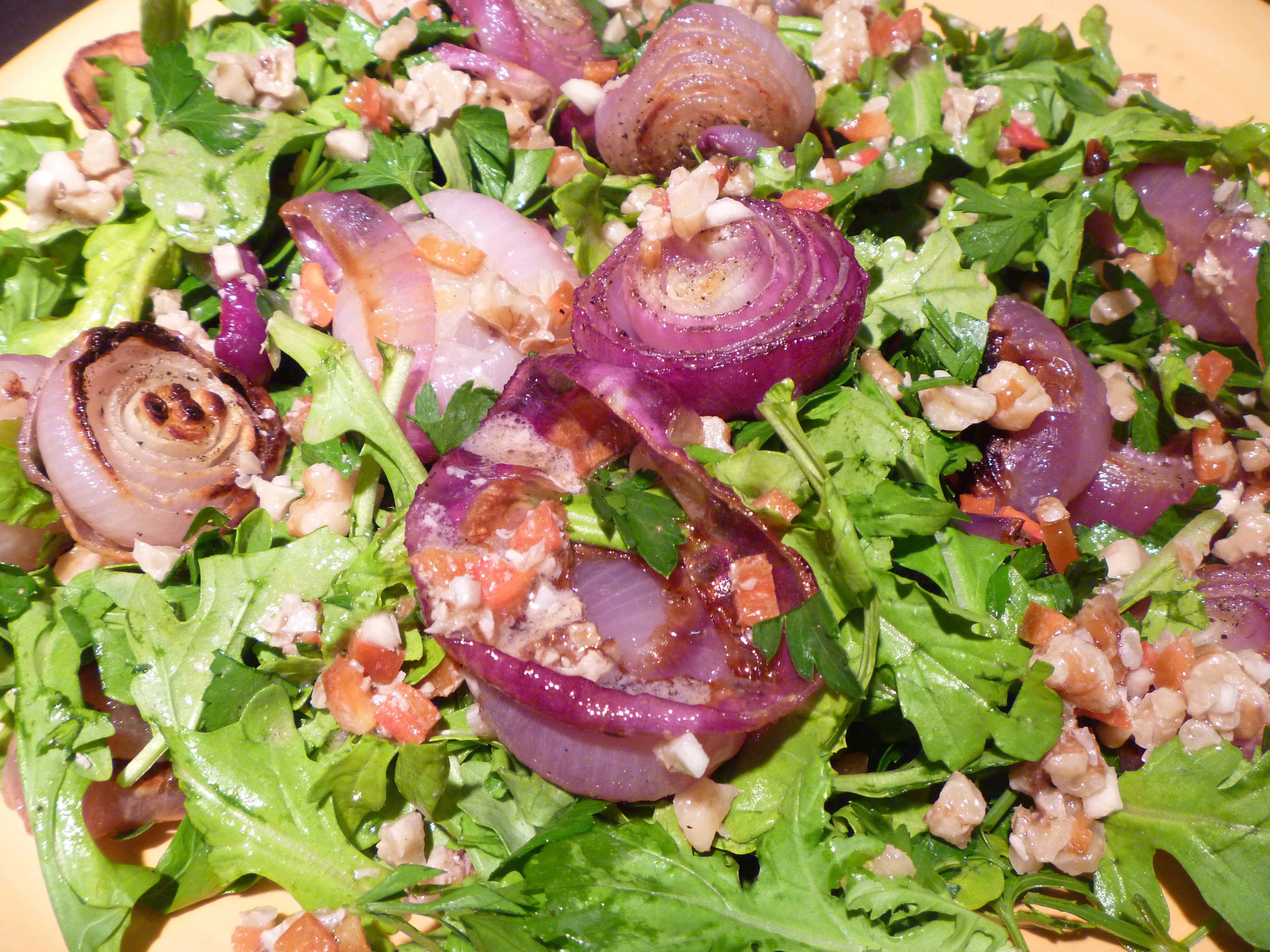 What a beautiful salad. I love roasting red onions too. And that walnut salsa sounds delicious xx