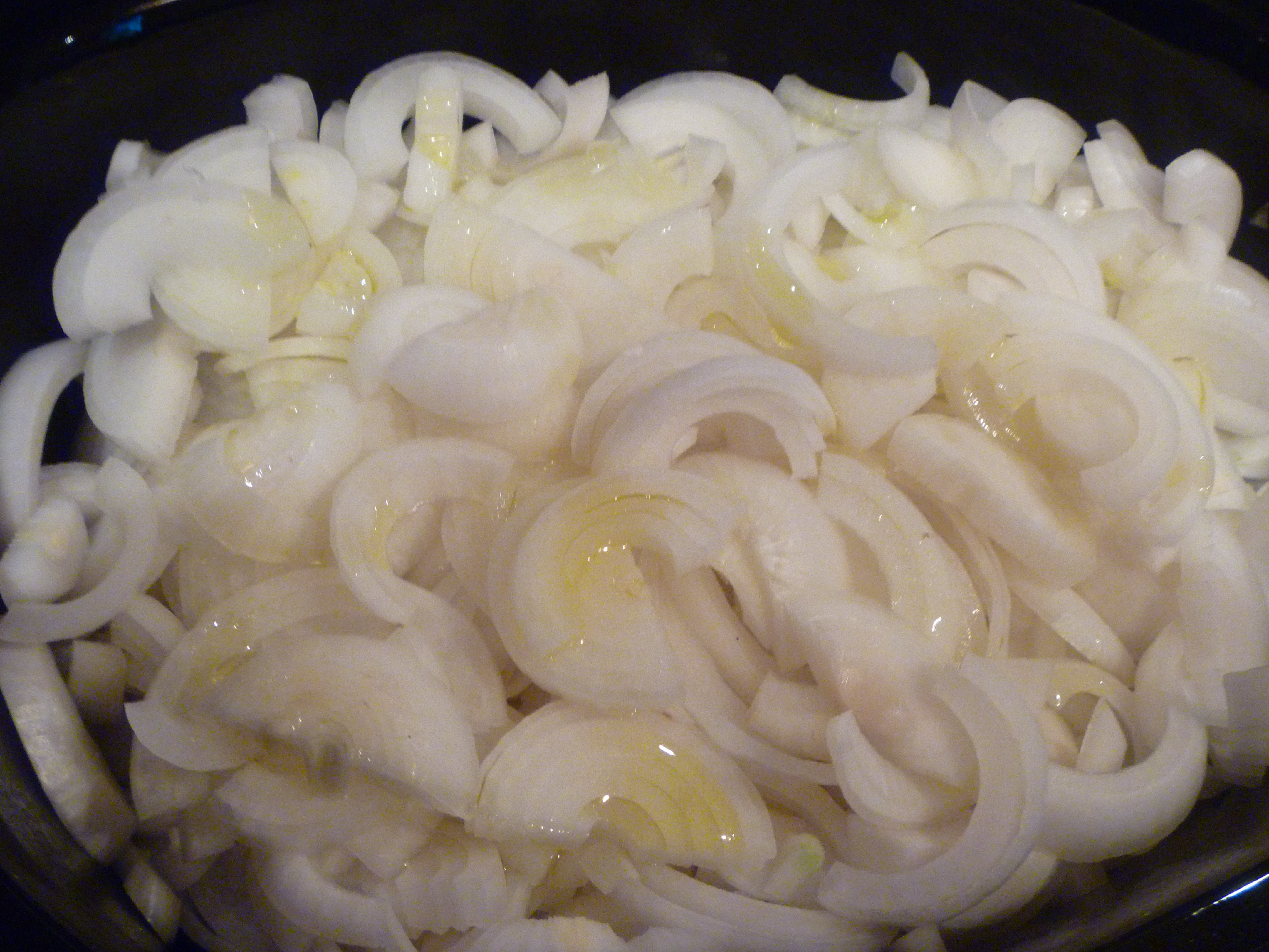 Peel the onions and cut them into thin slices; you should have at least 6 cups (exact amount is not crucial, though). Mist the inside of the ceramic insert for the slow cooker with olive oil spray or other cooking mist. Place the onions into the crock pot and drizzle olive oil over the slices.