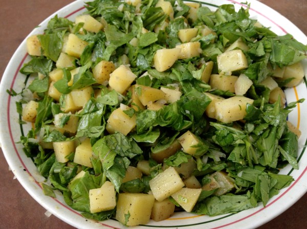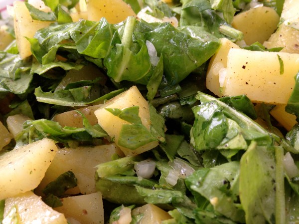 Our weather is finally beginning to cool off and it’s welcome. We can head outdoors for meals whether it is an elaborate picnic or just wandering out back with a sandwich. This week, this recipe came along with our CSA delivery. My first thought was “no, I don’t like potato salad” but this one has arugula. From a nutritional perspective it packs a ton of vitamin A and regardless, it’s the spicy green bite that I adore. There’s no goop and no dairy and I love the way that it incorporates healthy greens.