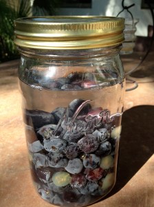 Whenever we see some interesting organic fruit or fresh leaf spice some gets nestled in a tiny mason jar with some alcohol. We’ve tried a pretty big variety of stuff; our favorite so far has been some really flavorful green grapes that we soaked in gin. It sounded like a weird combination and it worked out really well! Oddly, mango and rum did not. Nor did blackberries and whisky.