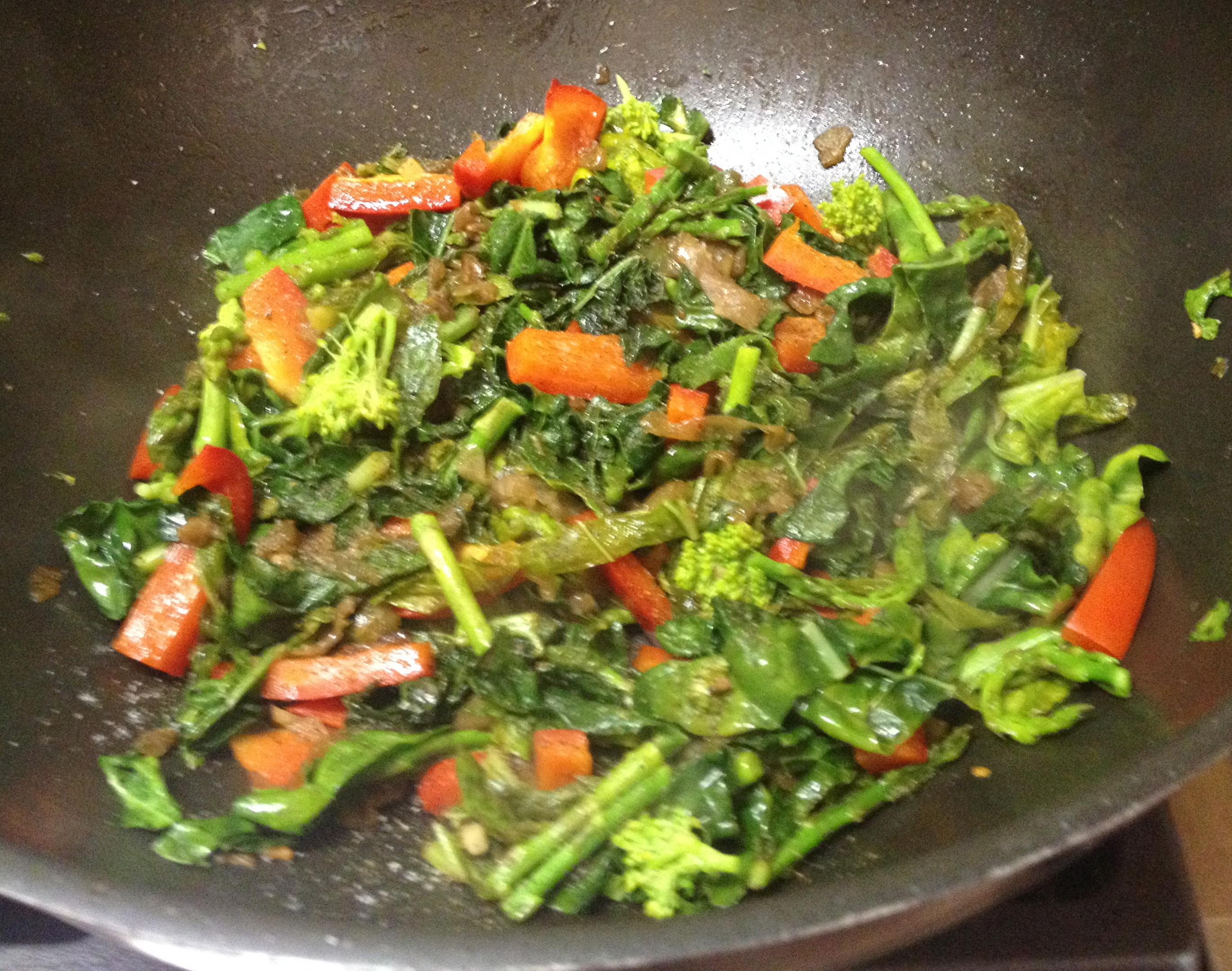 Allow greens to soften slightly before adding asparagus and red pepper. Once added, give it a few minutes and a few good stirs until the asparagus and pepper is tender. Salt and pepper to taste.