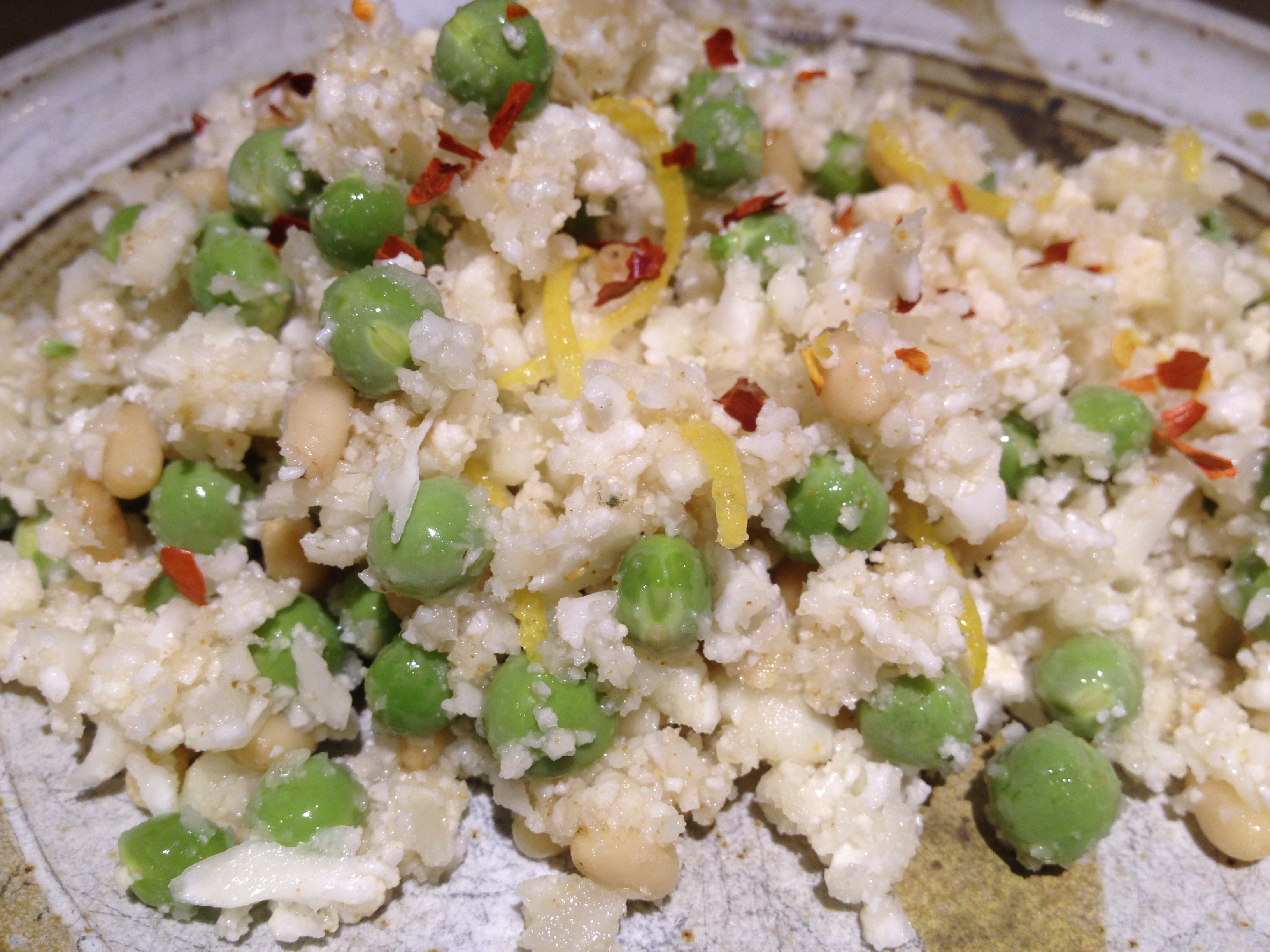 Cut the cauliflower florets from the stem. Pulse in food processor until it is the size of pieces of rice. Stir in peas and onion. Whisk together lemon juice, lemon zest, cumin, maple syrup, and ginger. Pour over cauliflower mixture and stir to combine. Top with pine nuts and chili flakes. Salt and pepper to taste.IMG_2149